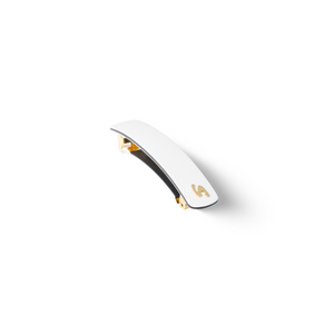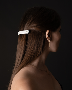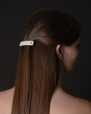 The SACRAE Barrette Classique M in Cream & Black Mazzucchelli acetate embodies timeless Parisian elegance. Handmade in France, this 8cm silhouette offers quiet sophistication and effortless style.