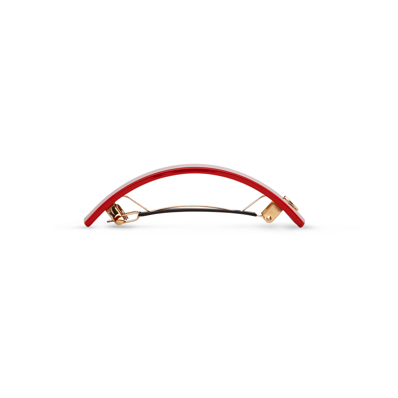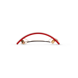 Architectural and assured, the Barrette Classique L translates the city’s midnight geometry into a 10 cm statement form. Cut from crimson Mazzucchelli acetate, lit with Swarovski® detail, and sealed with the 14K gold-plated “S”, it balances structure with sensuality.