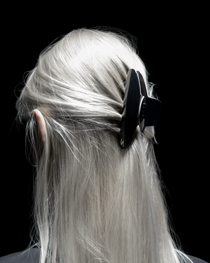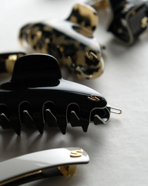 The SACRAE Pince Iconique L in Black & Cream acetate is a statement of sculptural luxury. Handmade in France, it fuses architectural lines with Parisian refinement.