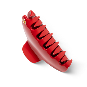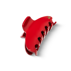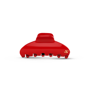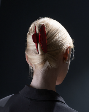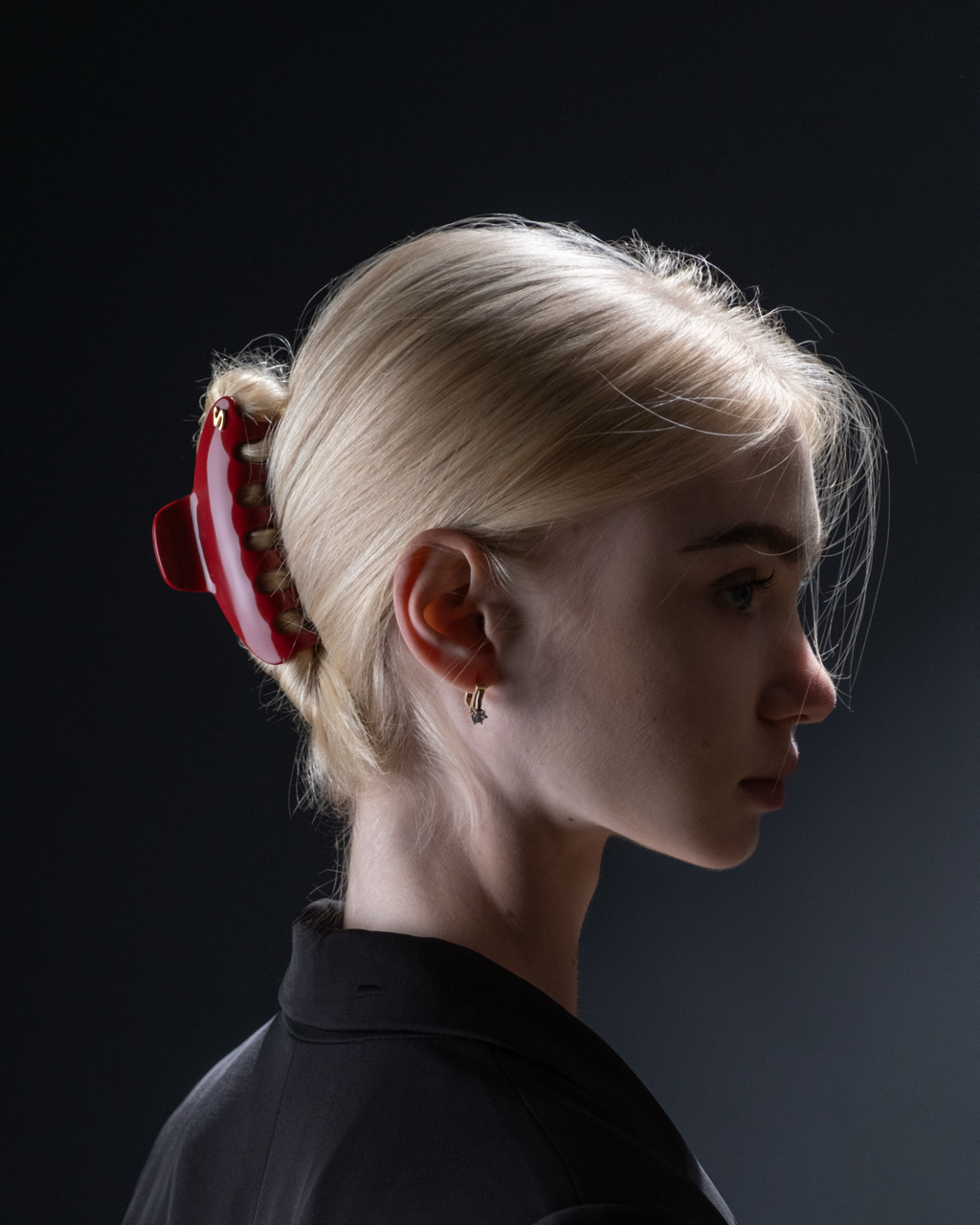 Sculptural and quiet-powerful, the Pince Iconique L frames the head like a piece of modern jewelry. In deep rouge Mazzucchelli acetate with Swarovski® brilliance and a 14K gold-plated “S”, it turns an updo into a signature.