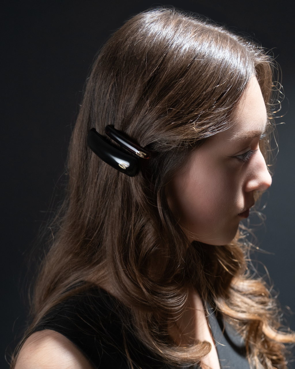 The Jonc Classique Barrette in warm tortoise acetate embodies the essence of timeless Parisian elegance. With its refined 7 cm silhouette, it offers an effortless way to elevate everyday hairstyles.