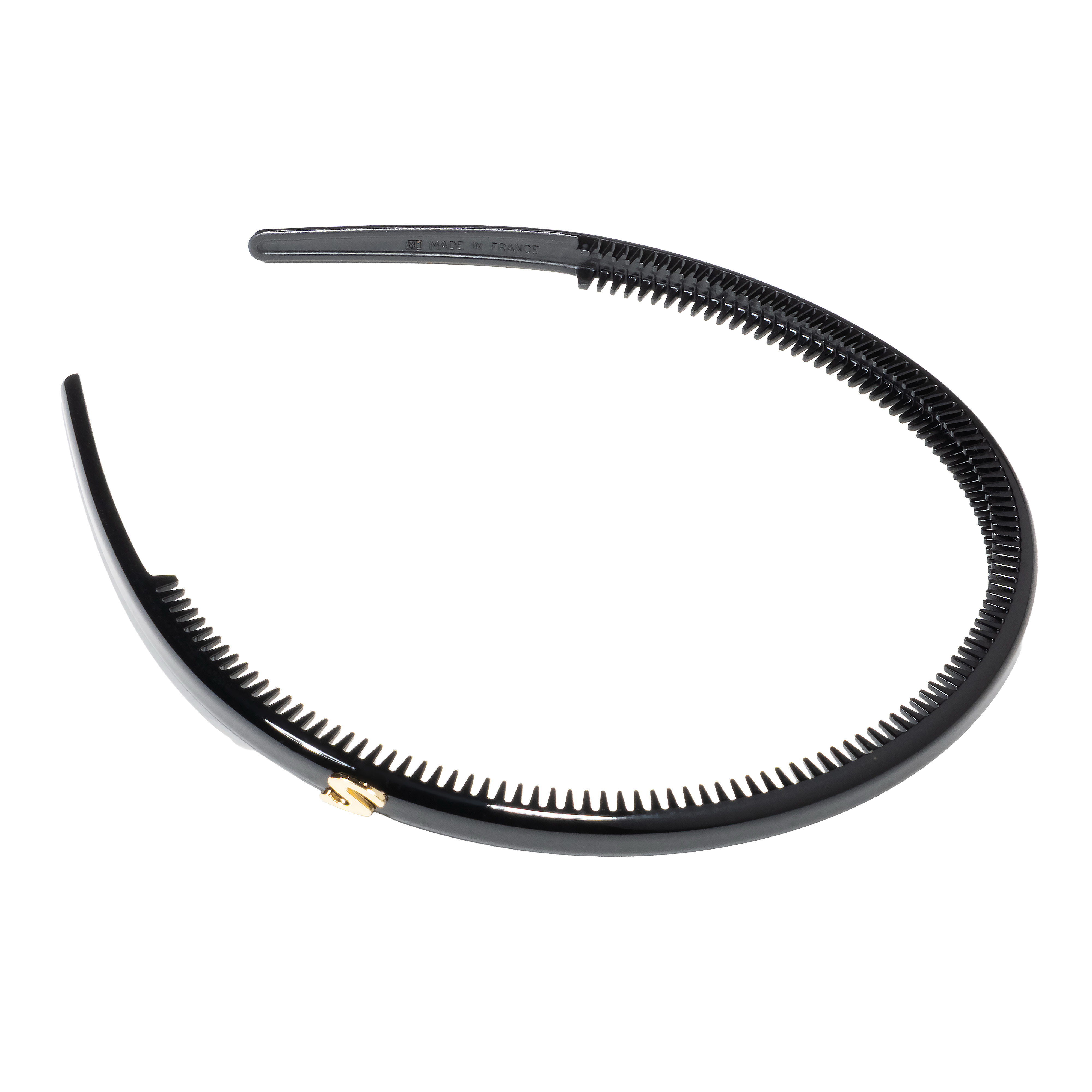 The Sacrae Signature Headband in glossy black acetate is a sleek, minimalist essential designed for modern Parisian styling. Its slim silhouette adds an effortless edge to everyday looks and evening refinement.